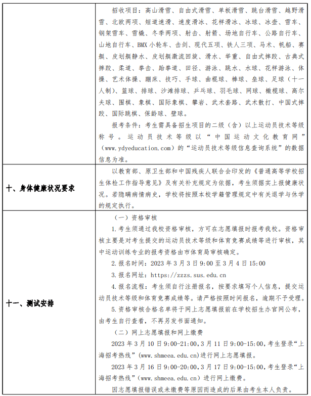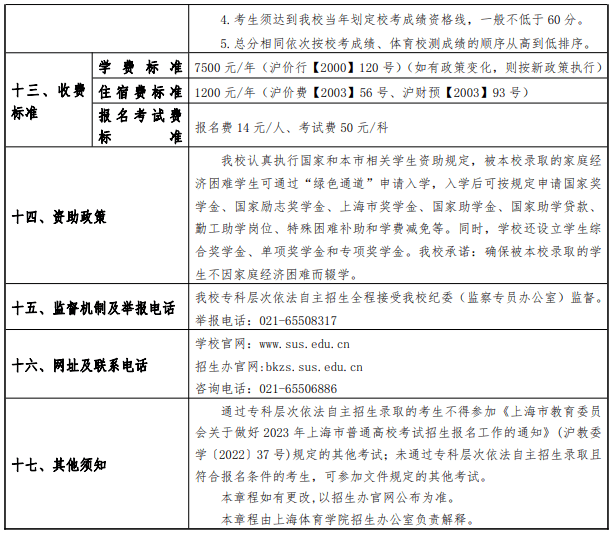 上海体育学院2023年上海市专科层次依法自主招生章程